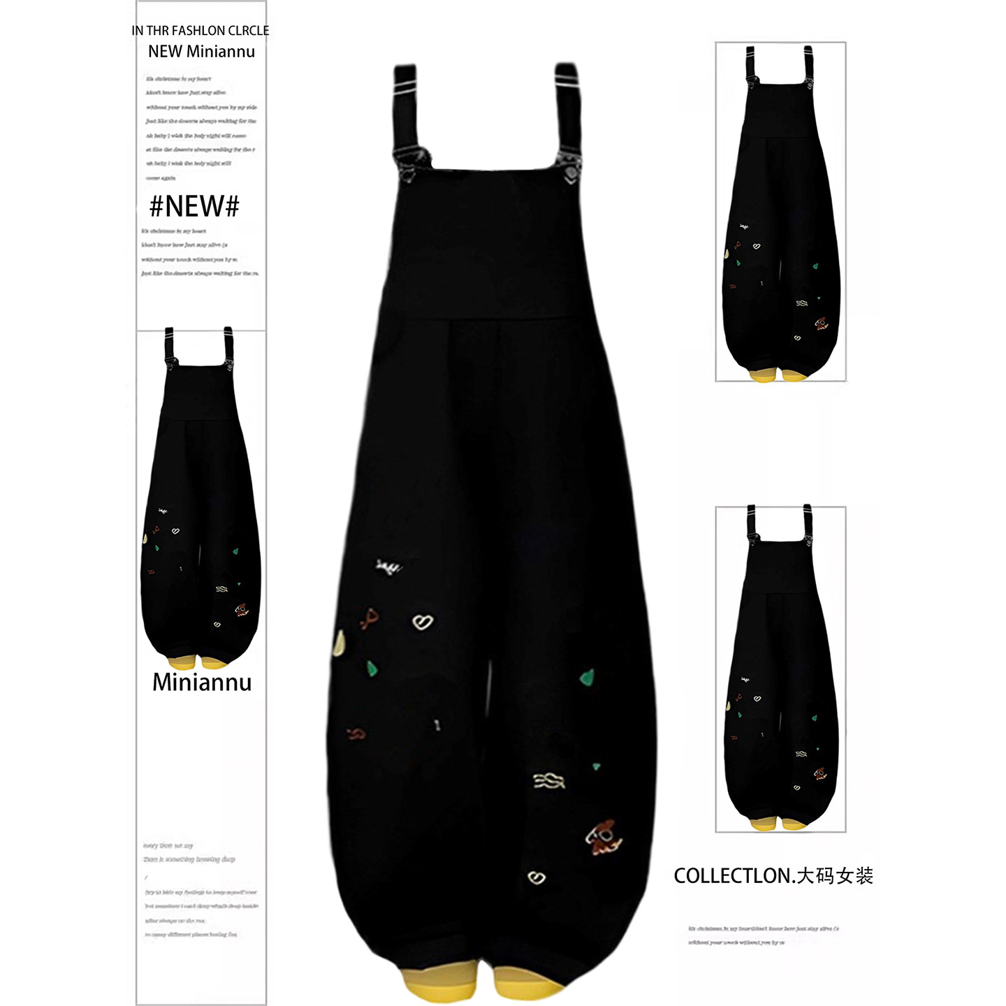 特大码黑色卡通刺绣工装牛仔背带裤女胖mm学院风减龄显瘦阔腿长裤