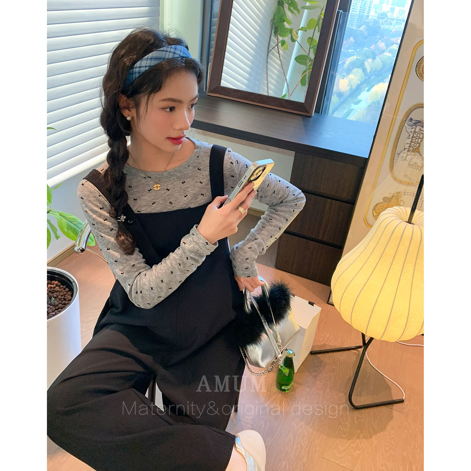 2025秋季新款孕妇装休闲外穿长袖波点上衣打底黑色背带裤女两件套