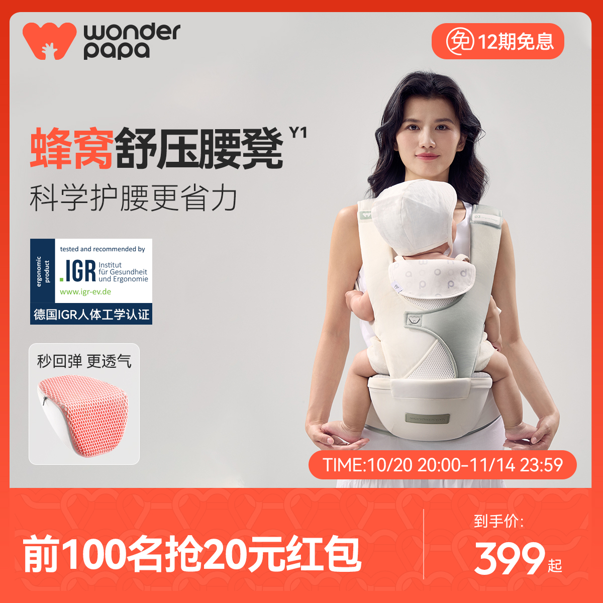 三只爸比Y1蜂窝舒压腰凳婴儿背带轻便四季多功能二合一抱娃神器