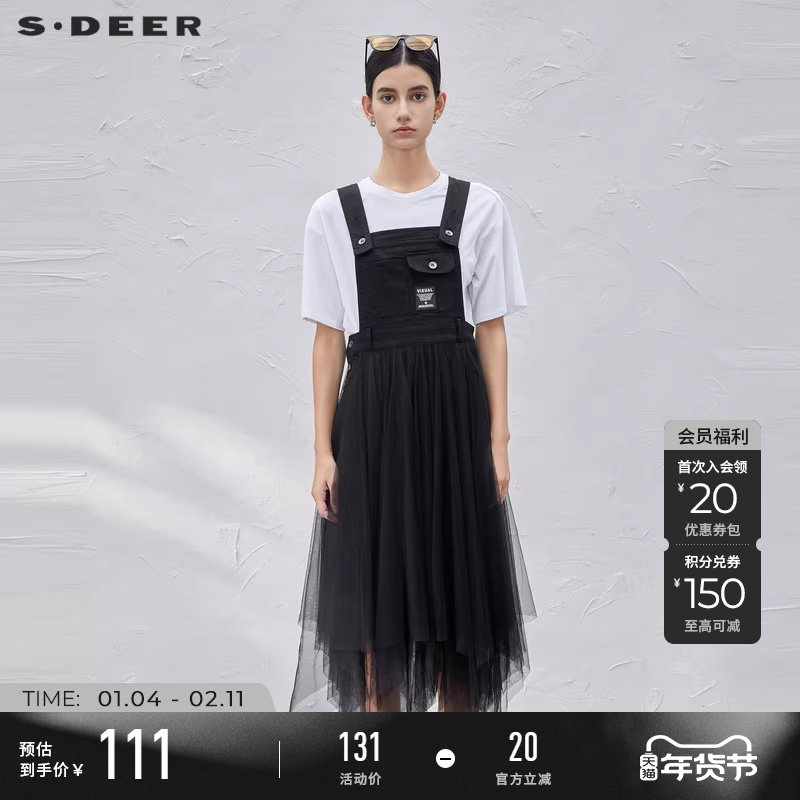 sdeer圣迪奥女装春秋装学院风字母网纱背带连衣裙S211T1207