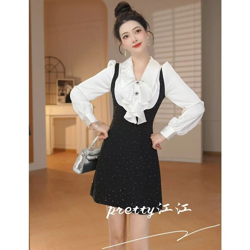 烫钻撞色学院风背带连衣裙新款翻领假两件设计小个子收腰礼服裙子