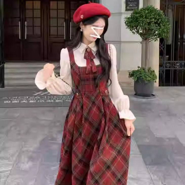甜美小个子学院风红格纹毛呢背带连衣裙女搭配杏色长袖衬衫送领结