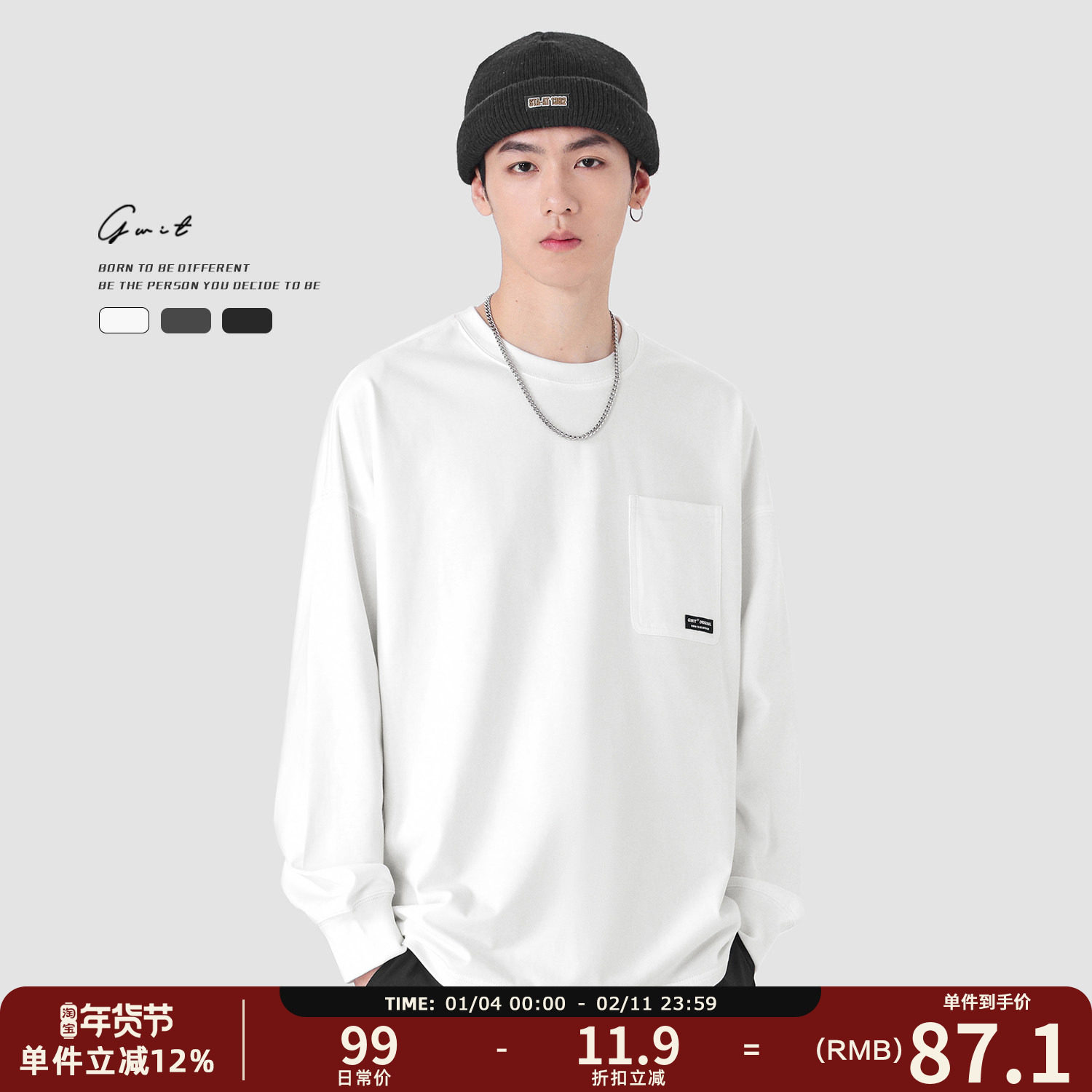 GWIT 美式重磅宽松春秋纯棉内搭口袋体恤打底衫圆领纯色长袖T恤男