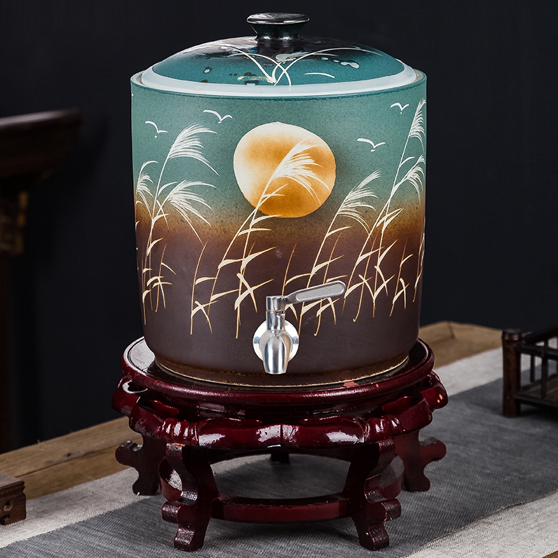 纯手绘陶瓷水缸储水罐6升12斤凉开水家用蓄水桶饮料桶带龙头底座