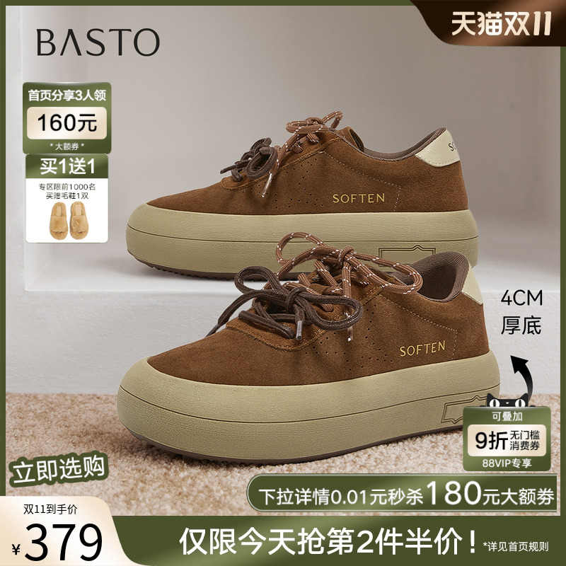 百思图2025秋季商场新款真皮松糕厚底板鞋女运动休闲鞋D3797AM6