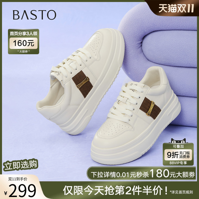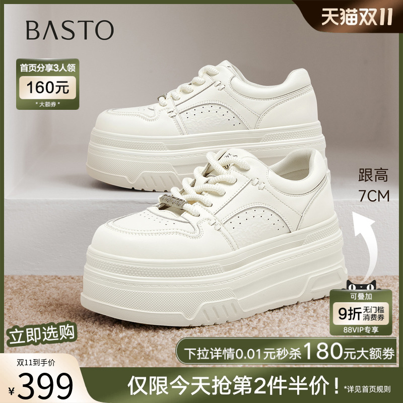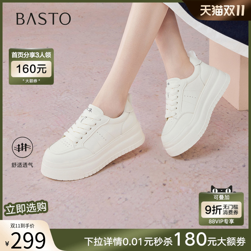 百思图25秋商场新款牛皮透气松糕厚底板鞋小白鞋女休闲鞋USN05CM5