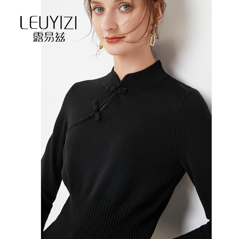 中国风盘扣100%羊毛连衣裙女旗袍领过膝中长款毛衣修身羊绒打底裙