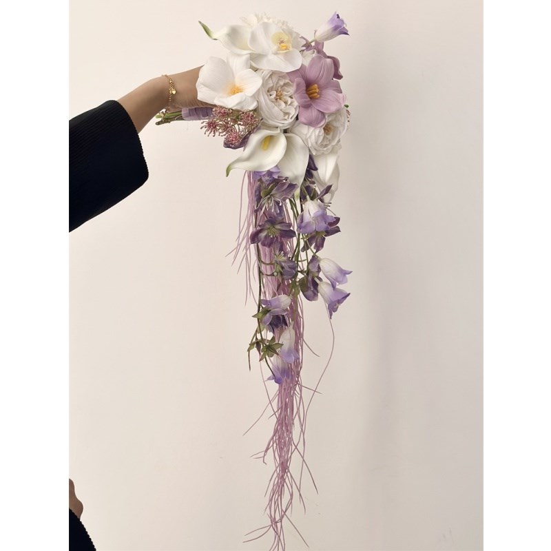高级感紫色瀑布彷真花婚礼新娘水滴手捧花结婚摄影手捧花领证花束