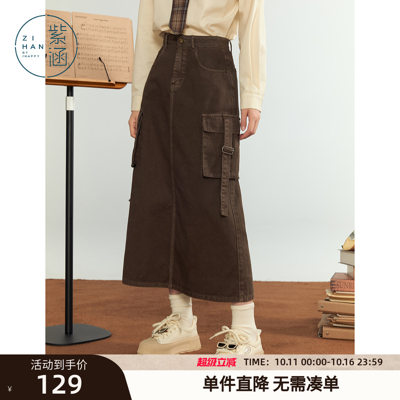 紫涵复古牛仔工装半身裙女秋季新款美拉德休闲高腰中长款a字裙子