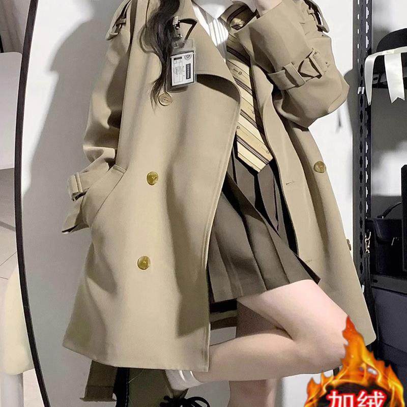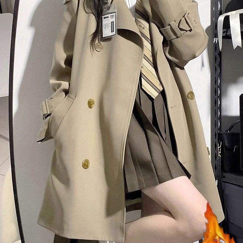 西装领风衣女学生双排扣加绒中长款小个子韩版外套秋冬季宽松系带