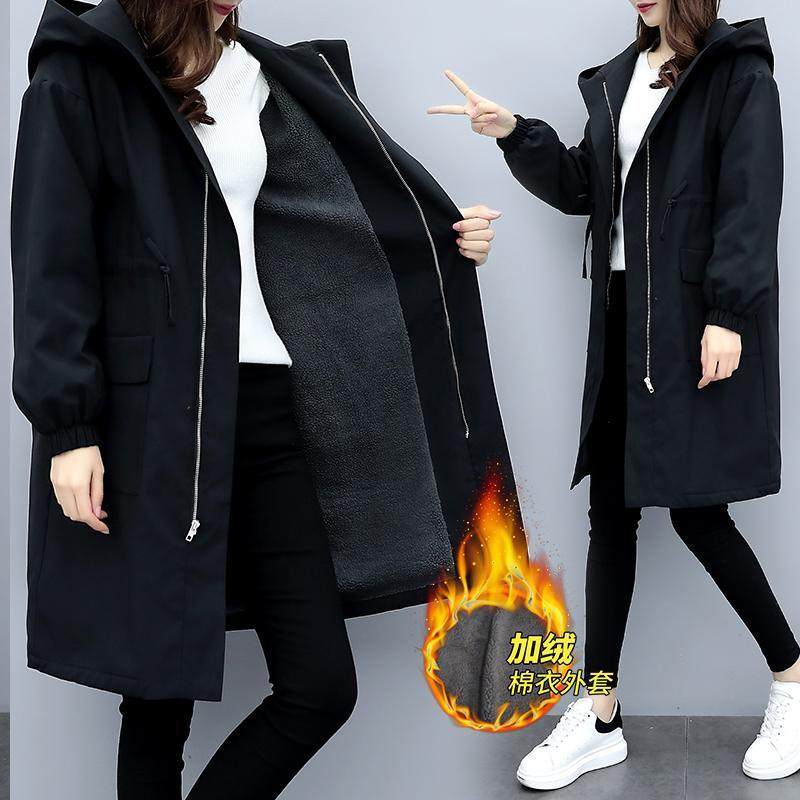 加绒加厚风衣女中长款外套女秋冬季2021连帽棉衣学生韩版宽松棉服