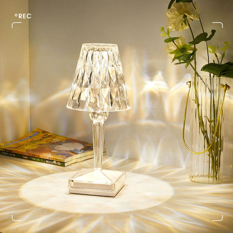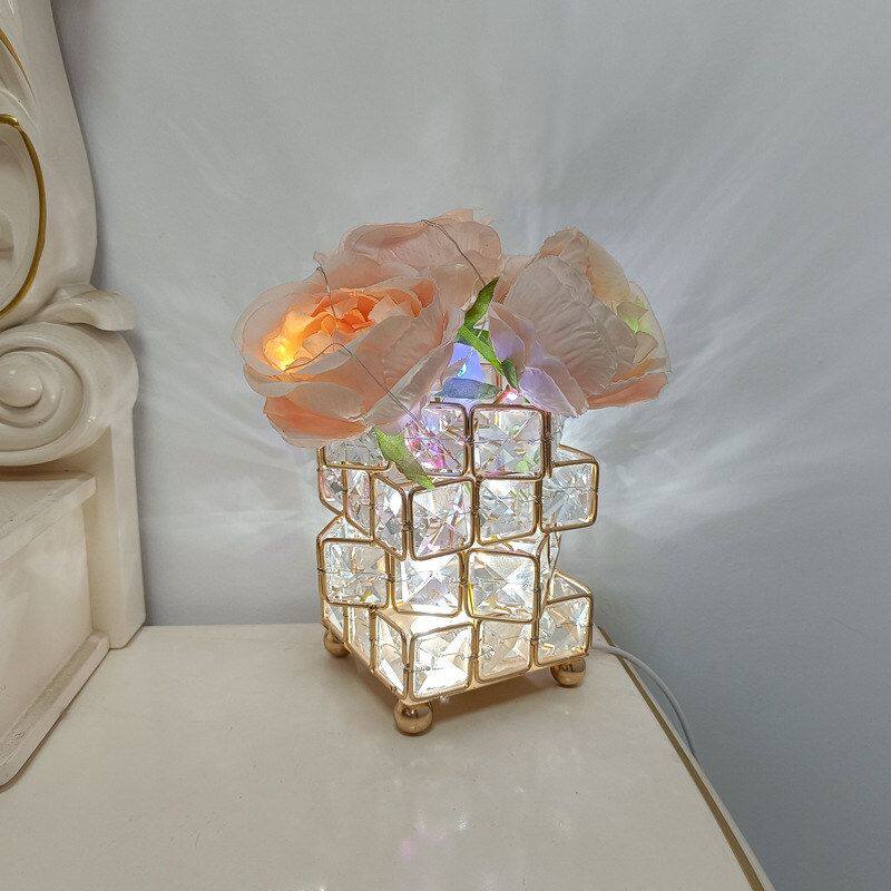 网红钻石水晶台灯卧室ins少女床头装饰台灯氛围玫瑰花水晶小夜灯