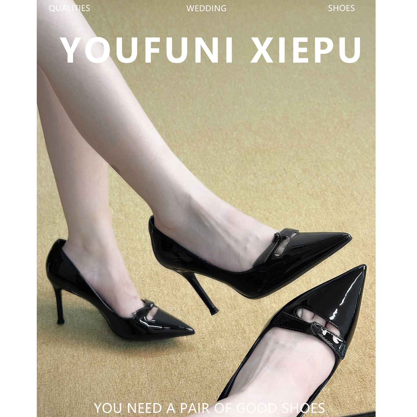 2025年新款黑色漆皮高跟鞋女细跟尖头性感中空一字带扣气质单鞋女