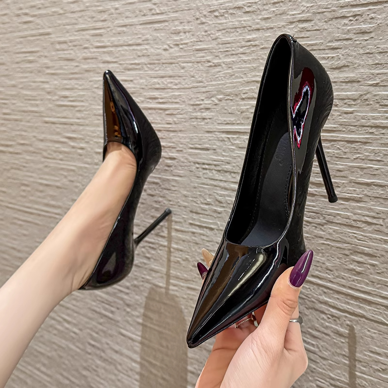 黑色漆皮高跟鞋女2025年新款法式细跟尖头浅口性感百搭职业单鞋女