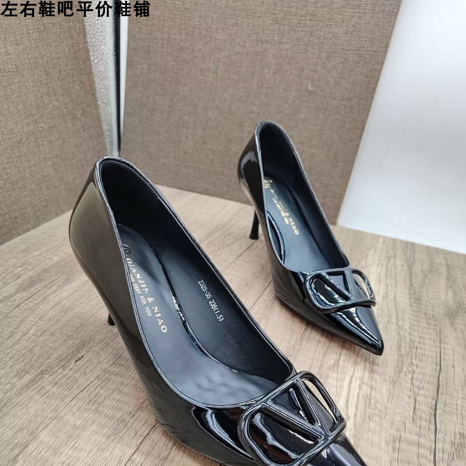 2025年新款细跟尖头通勤黑色漆皮高跟鞋女金属扣职业工作鞋不累脚