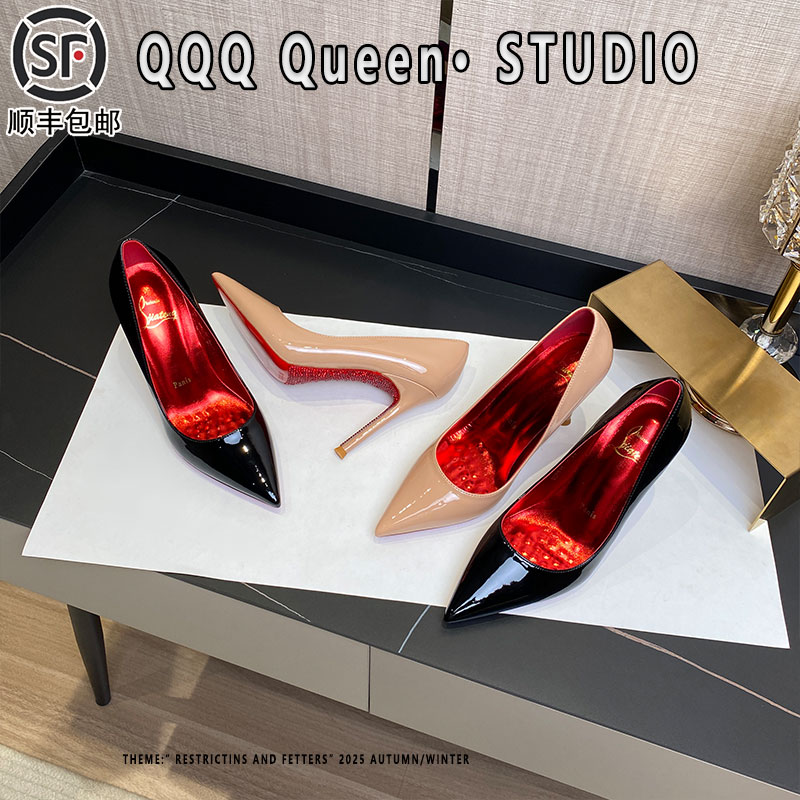 红底水钻黑色漆皮高跟鞋女2025秋季网红通勤久站不累脚真皮单鞋女