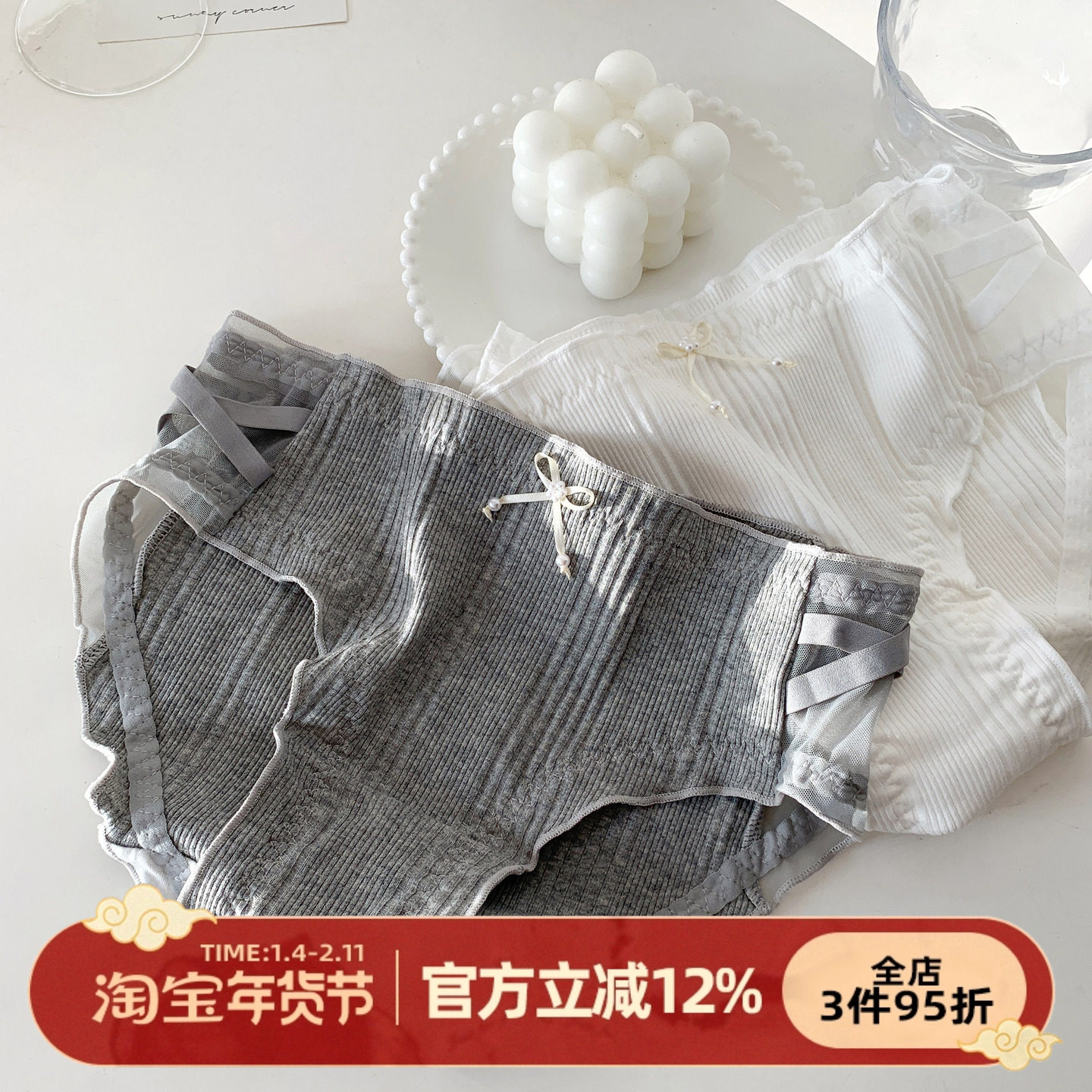 日系新款少女纯棉内裤女可爱两边蝴蝶结蕾丝花边甜美全棉低腰女士
