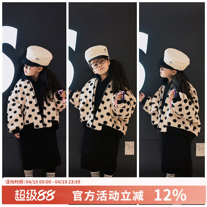 H AND E原创女童羊羔毛外套洋气加厚双层波点儿童短款加绒夹克