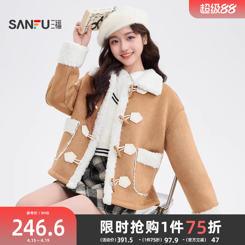 三福厚外套2025新款冬季小个子韩系麂皮绒拼接羊羔毛保暖上衣女装