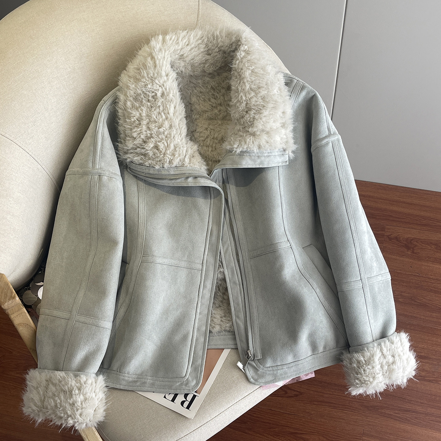 浅灰麂皮绒皮毛一体外套女毛绒绒加厚保暖羊羔毛内里棉衣棉服韩版