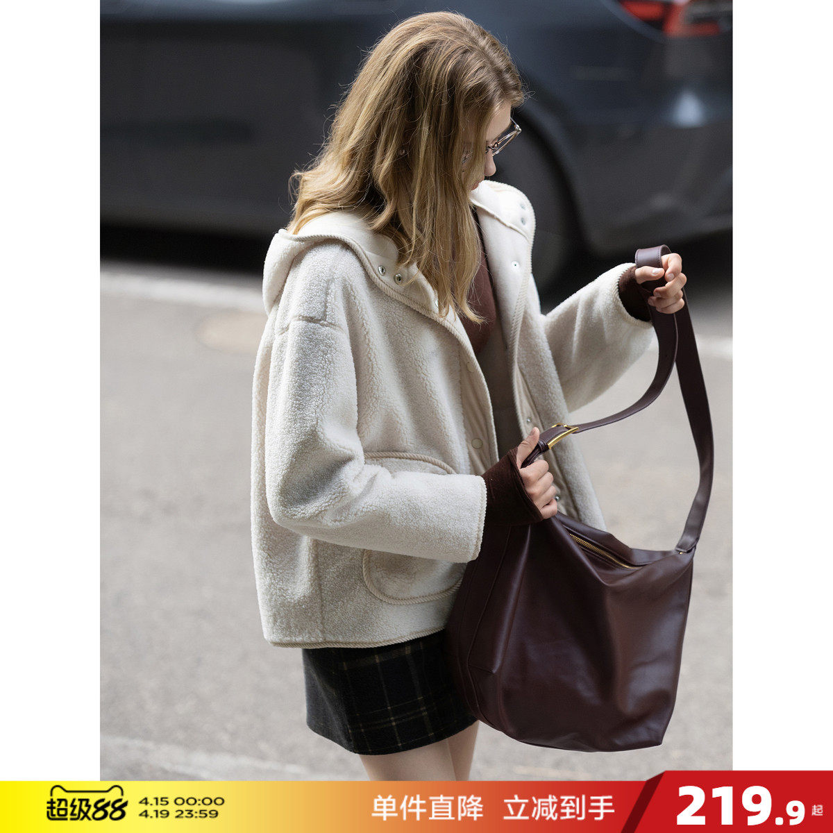VGRASS维格娜丝25冬新款100%羊羔泰迪外套麂皮绒白色宽松短款女
