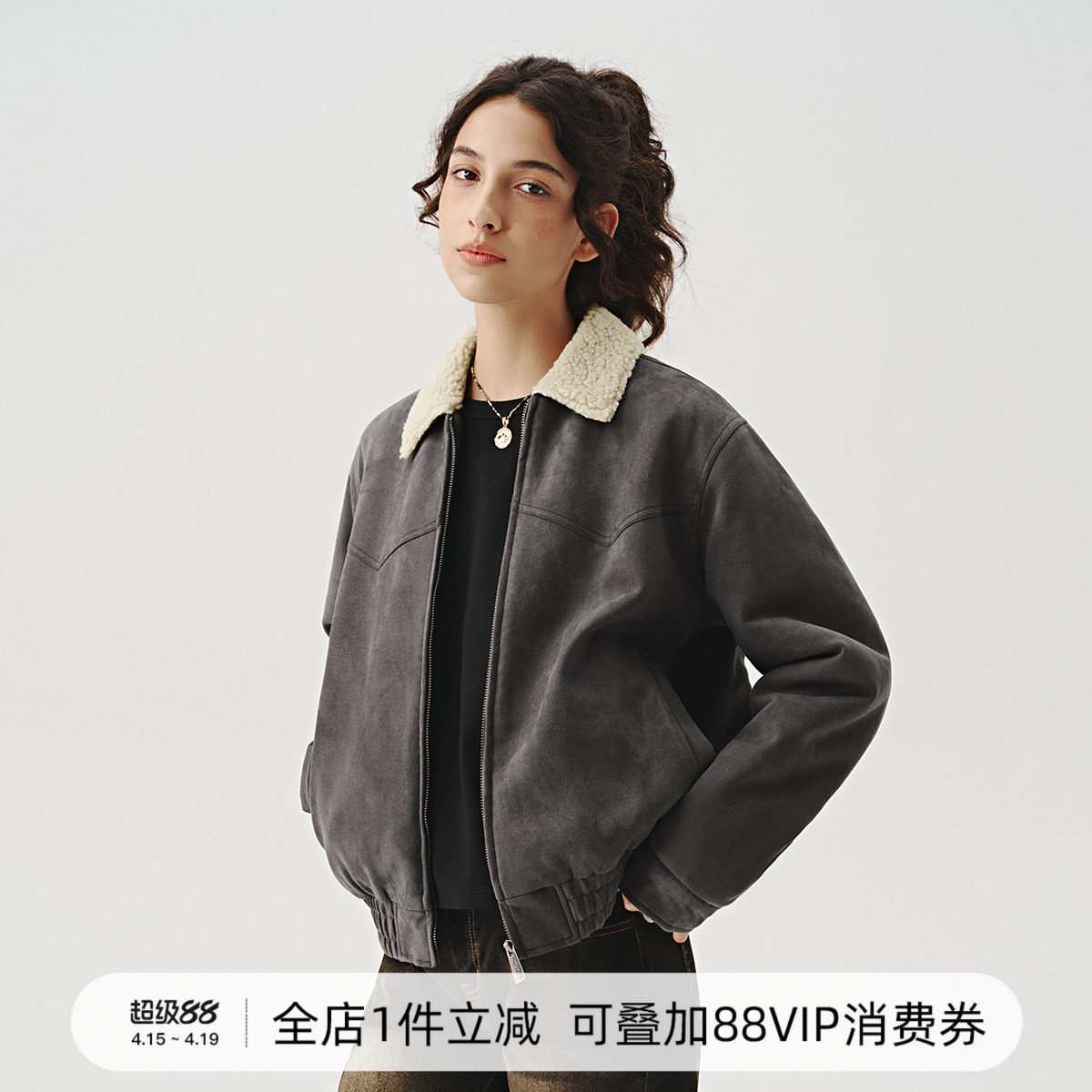Basic House/百家好仿麂皮羊羔毛立领外套女冬季加绒保暖机车夹克