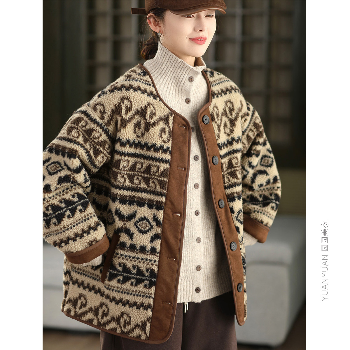 园园美衣冬季中长款费尔岛羊羔毛加厚外套内里麂皮绒保暖棉袄棉服