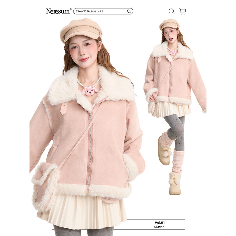 NERESUM甜美羊羔绒翻领棉衣女冬季麂皮绒加厚高级感短款棉服外套