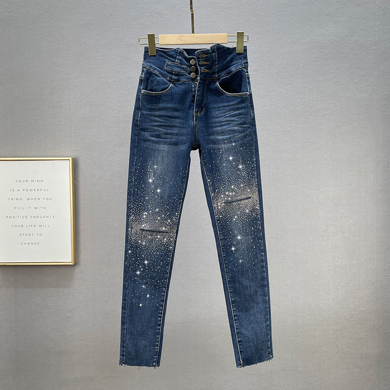ins欧货牛仔裤女2024春季新款高腰修身显瘦假破洞烫钻小脚铅笔裤
