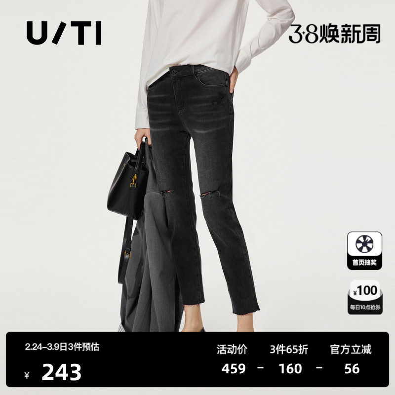 U/TI深灰色小狗破洞铅笔裤女百搭修身简约小脚裤尤缇时尚秋季新款