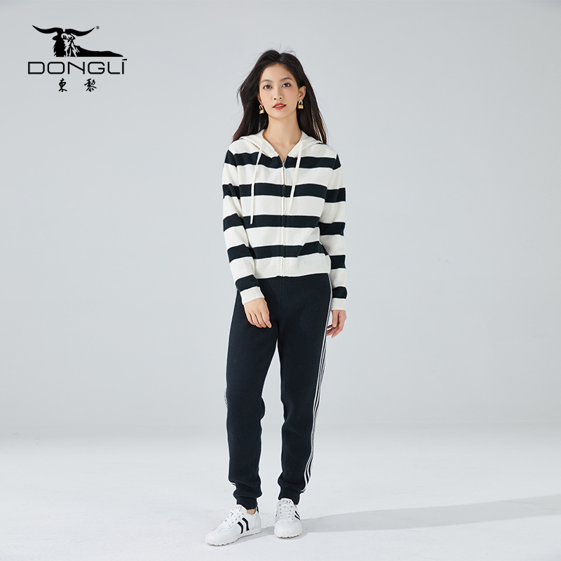 东黎山羊绒 秋冬季黑白撞色休闲纯绒柔软慵懒女士戴帽套头衫 3352