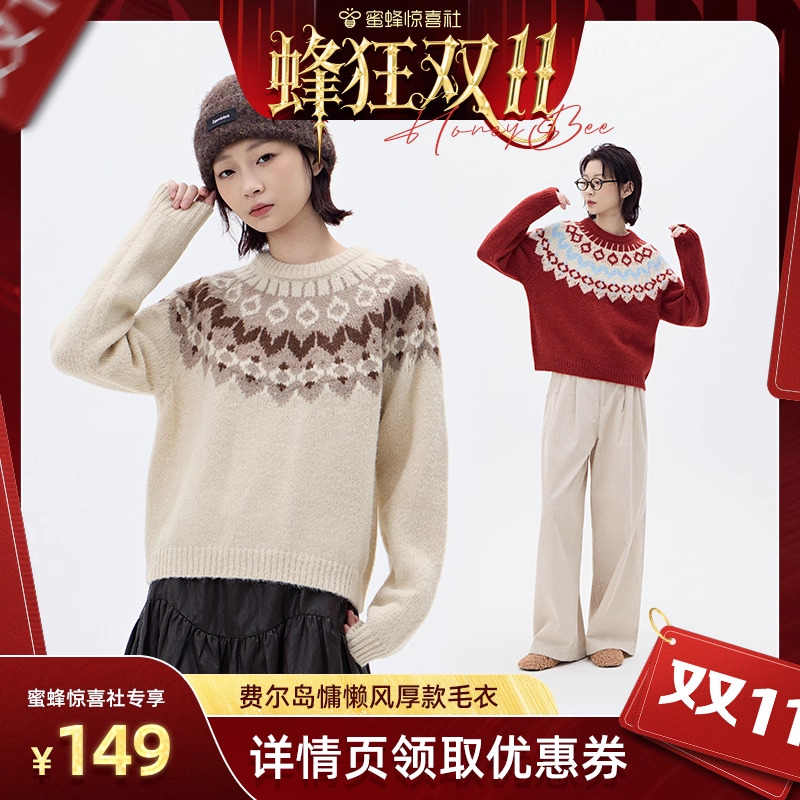 北欧时刻复古费尔岛红色毛衣女秋冬新款慵懒风设计厚款圣诞针织衫