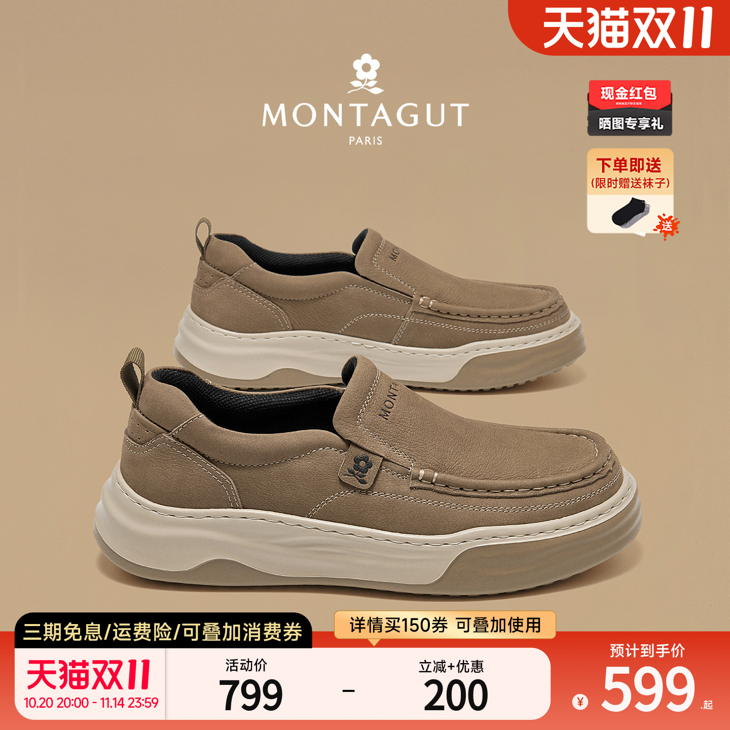 梦特娇2025爆款男鞋秋冬头层牛皮增高休闲板鞋缝线一脚蹬工作皮鞋