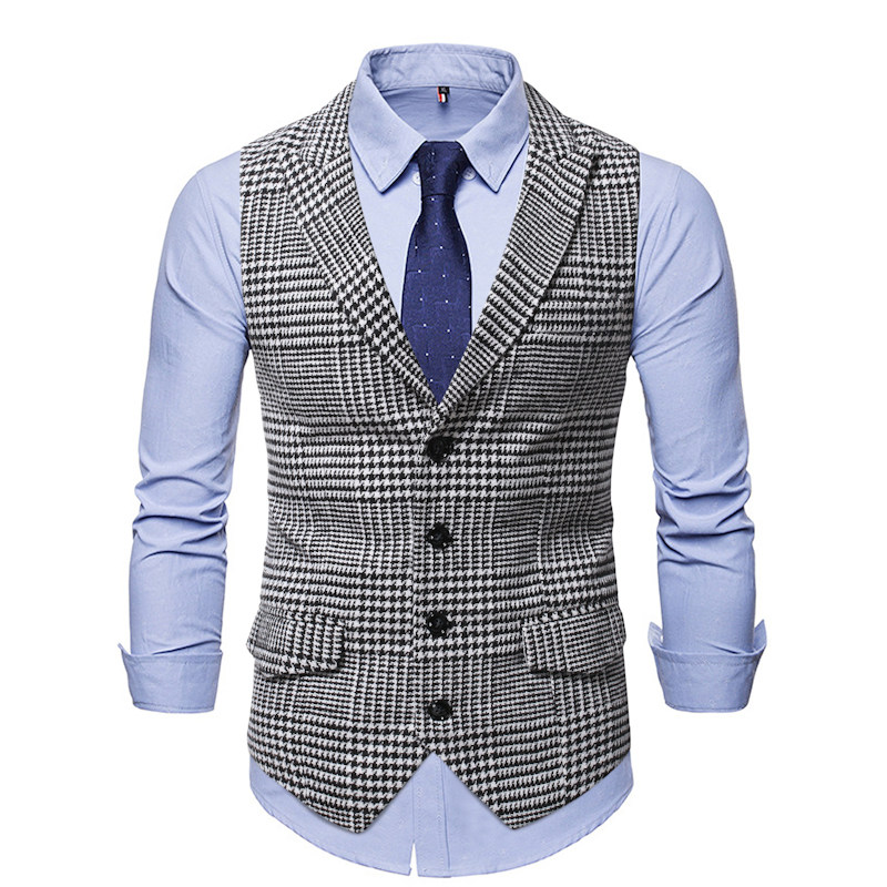 英伦复古休闲千鸟格西装马甲男秋冬加厚毛呢外套拼接麂皮绒马夹潮