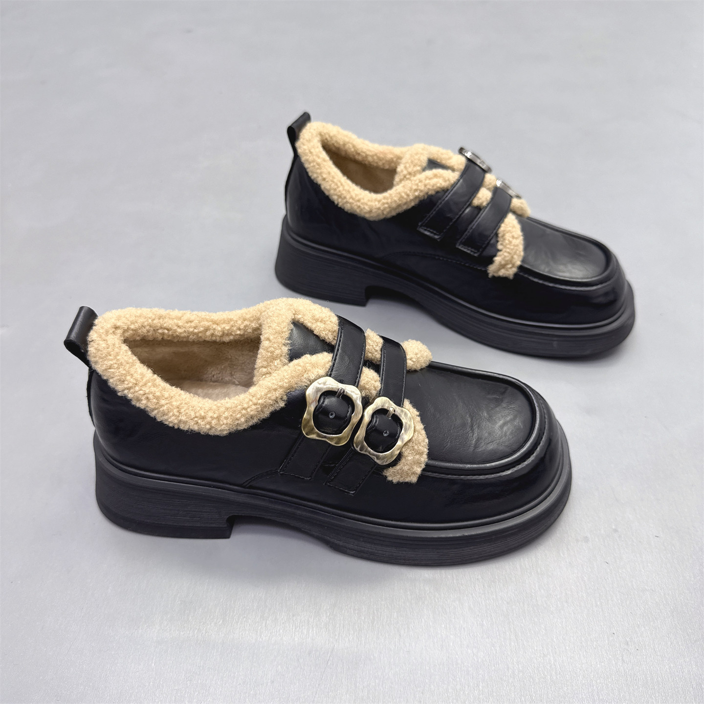 复古韩版平底毛毛鞋加绒玛丽珍小皮鞋女2025秋冬新款棉鞋网红单鞋