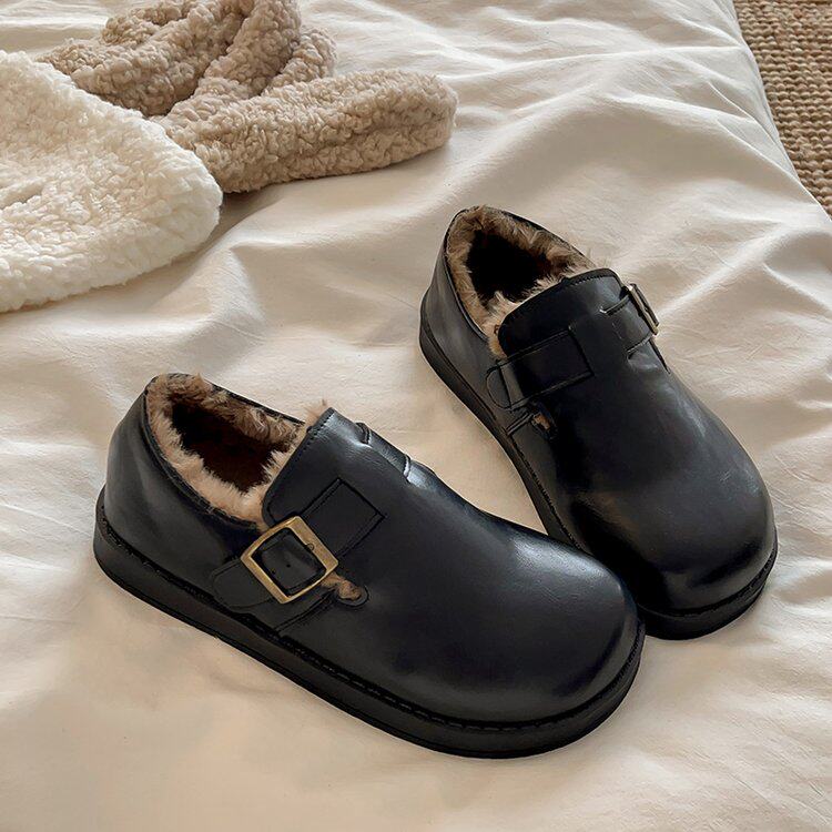 韩版复古加绒小皮鞋女一脚蹬毛毛鞋2025新款秋冬豆豆鞋乐福棉鞋子