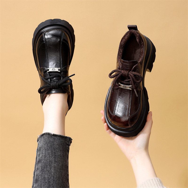 韩版时尚厚底系带小皮鞋女2025秋冬新款加绒舒适显脚小轻便乐福鞋