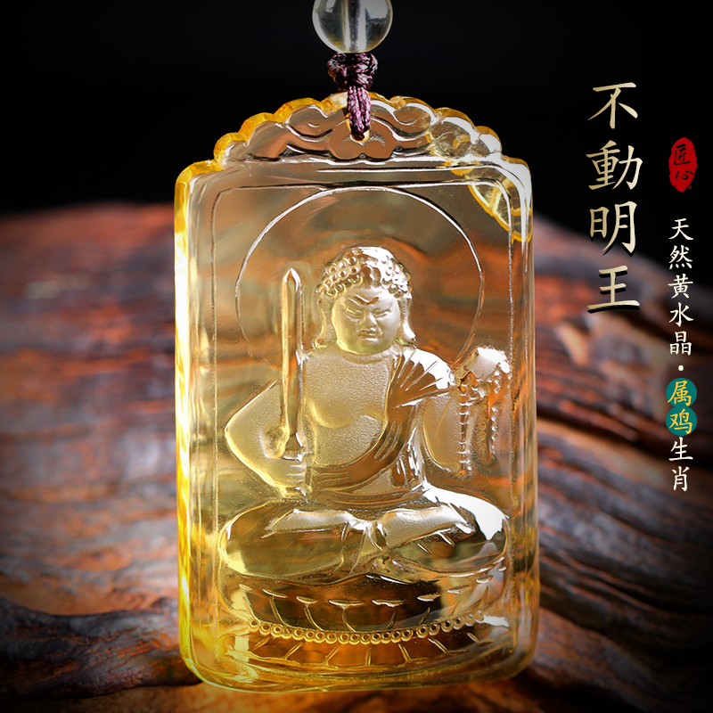 天然水晶黄玛瑙生肖本命佛吊坠不动尊菩萨属鸡不动明王守护神饰品