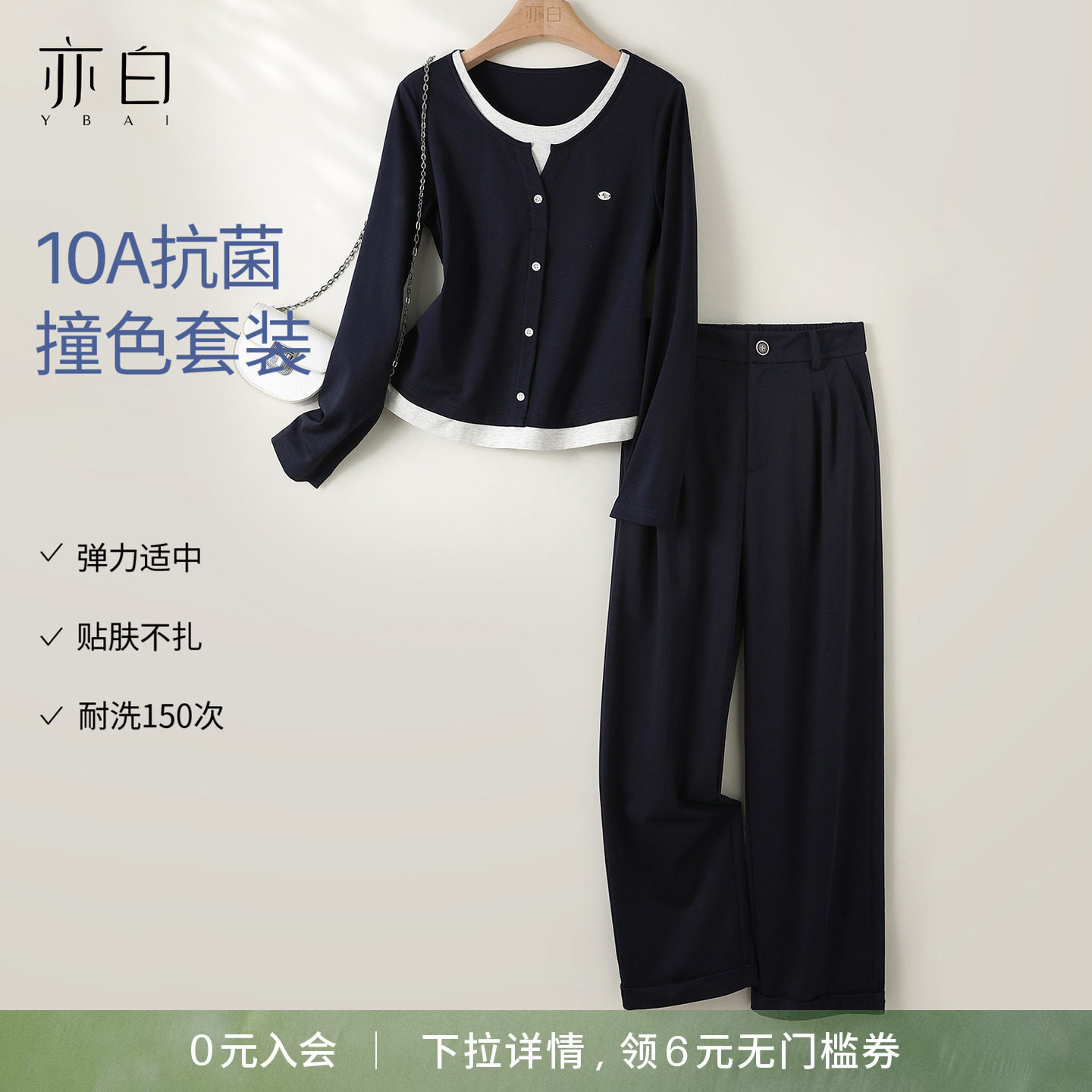 YBAI/亦白26春季新款时尚简约休闲撞色假两件针织T恤休闲裤套装女