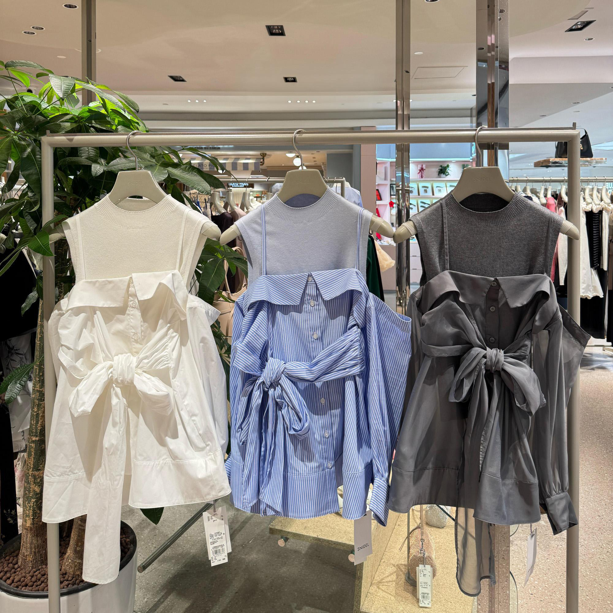 时髦MIU女郎 超人气 可前后系蝴蝶结露肩衬衫+针织背心两件套装