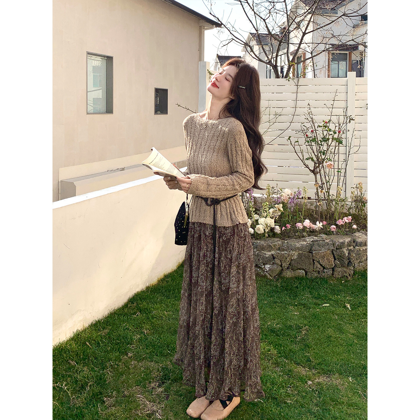 法式浪漫慵懒风针织上衣碎花半身裙两件套女2026春季新款时尚套装