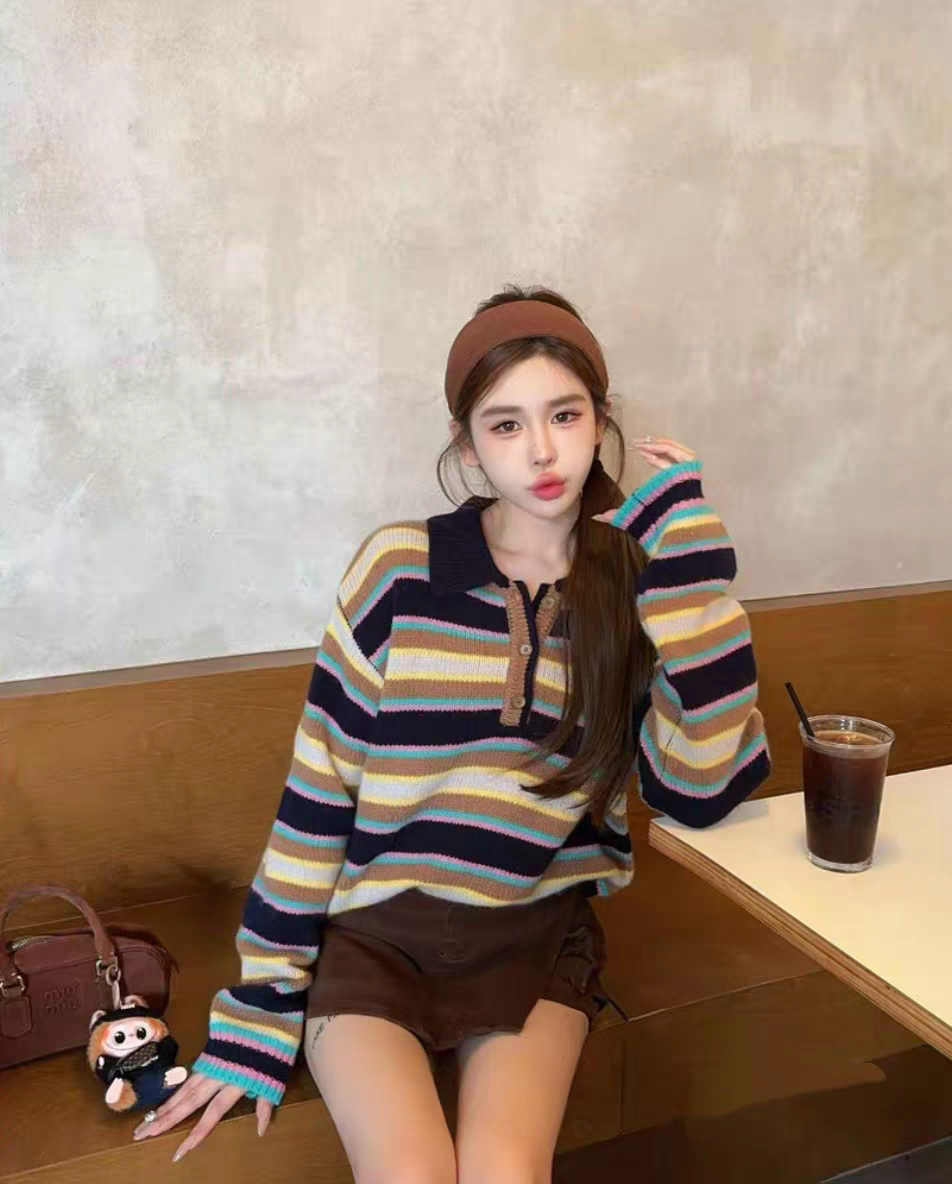 2025秋冬新款韩版宽松显瘦翻领条纹针织衫女百搭休闲毛衣外穿上衣