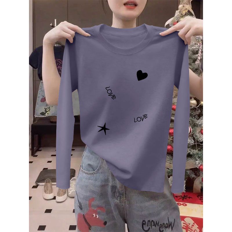 DW秋冬韩版宽松显瘦圆领长袖T恤女百搭洋气爱心打底衫上衣7463