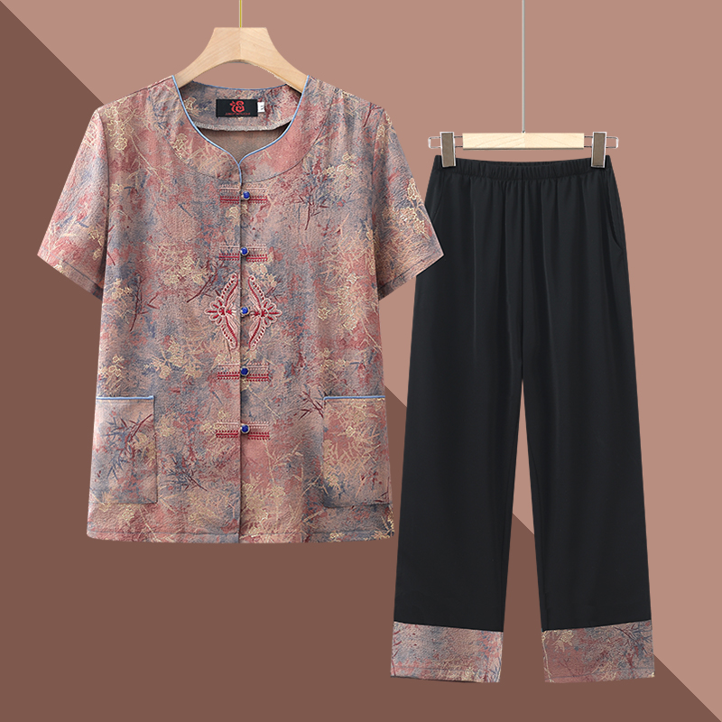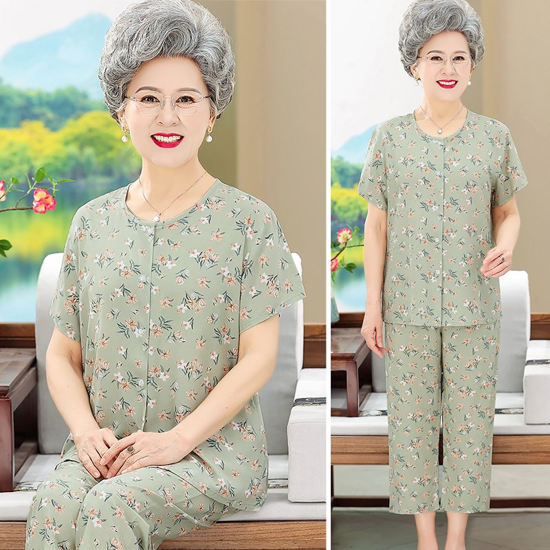 中老年女装夏款妈妈短袖套装棉绸两件套老人夏天衣服家居服老太太