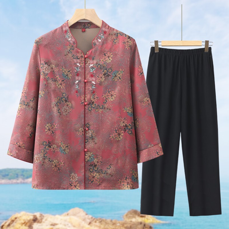 妈妈夏装套装奶奶装夏季两件套70岁老年人女装老太太夏天衣服长袖