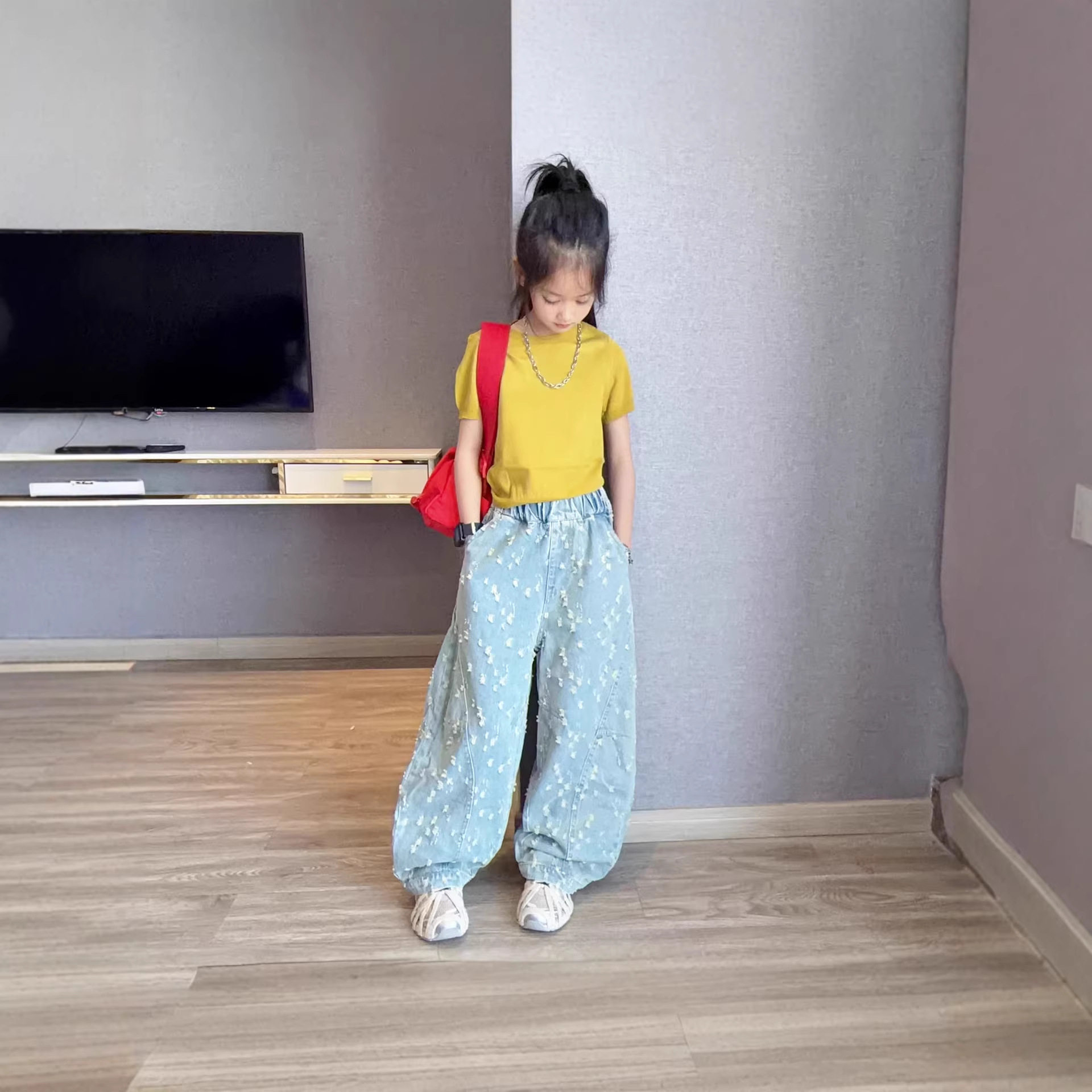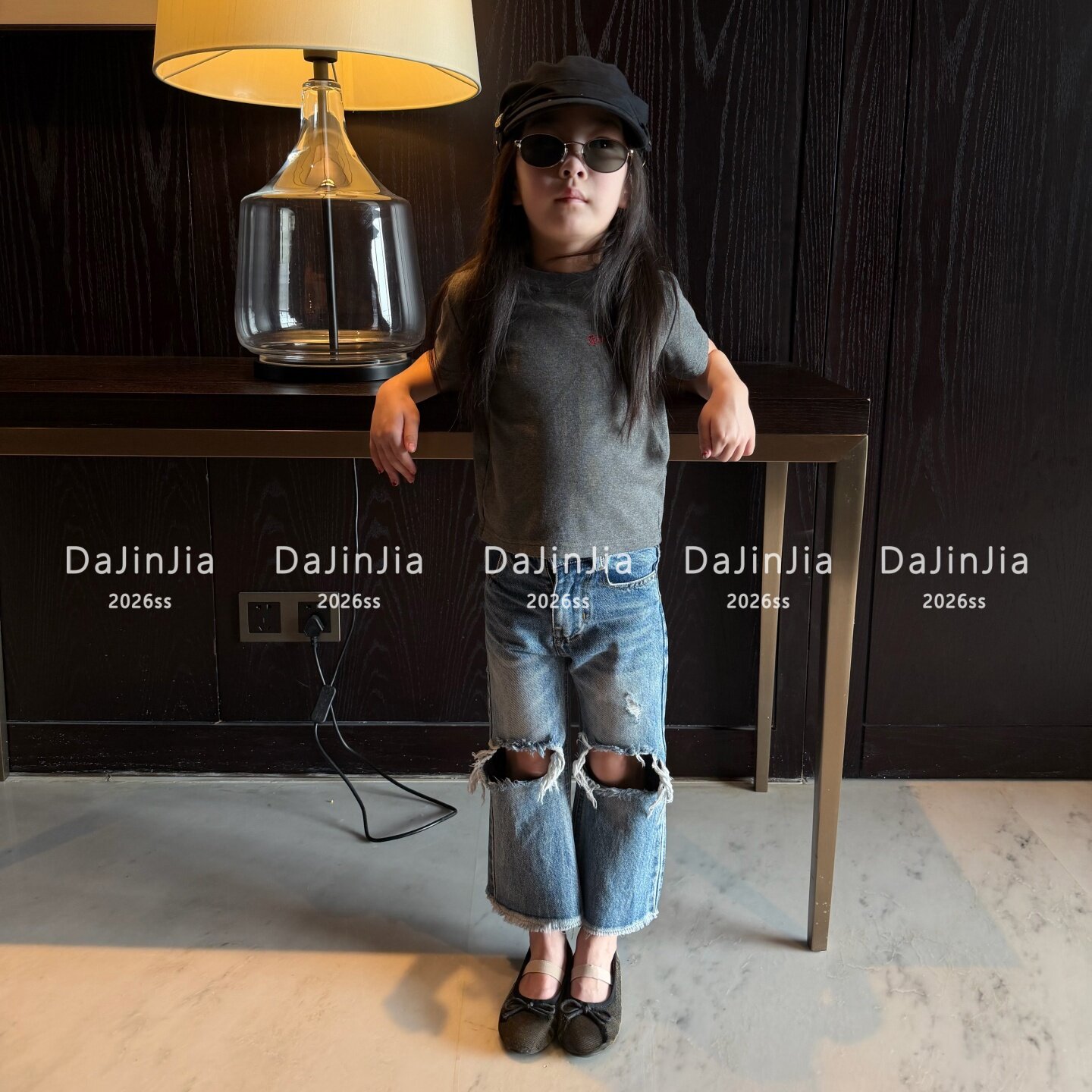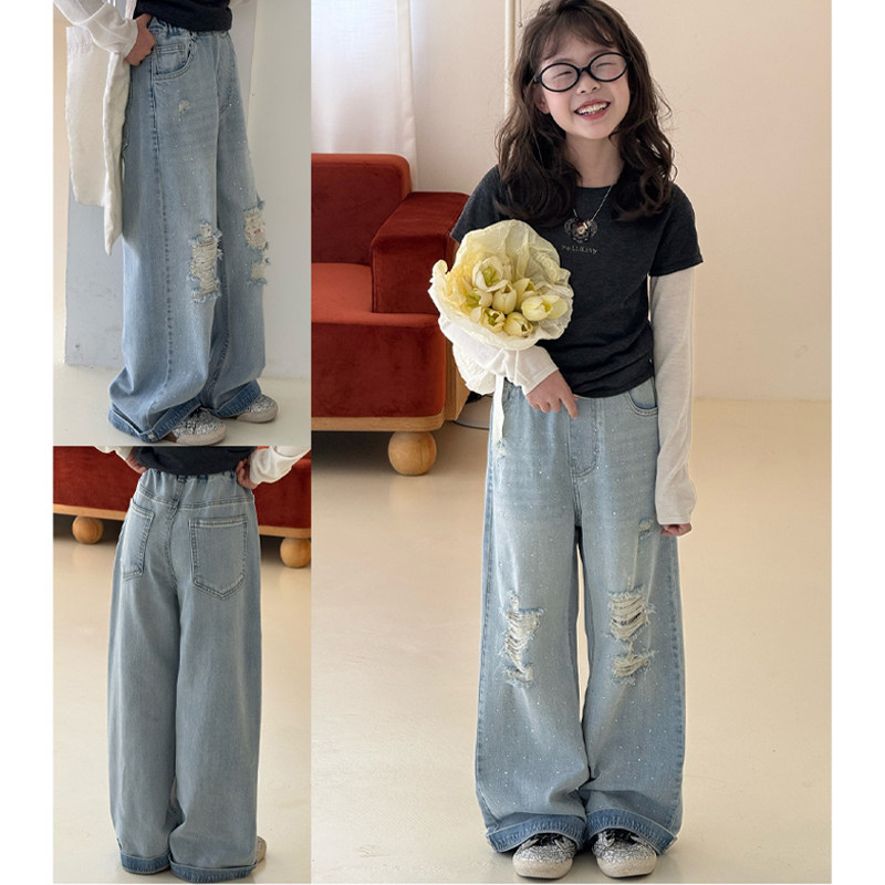 天依角2026春夏季新款女童时尚宽松直筒裤烫钻破洞牛仔裤18053