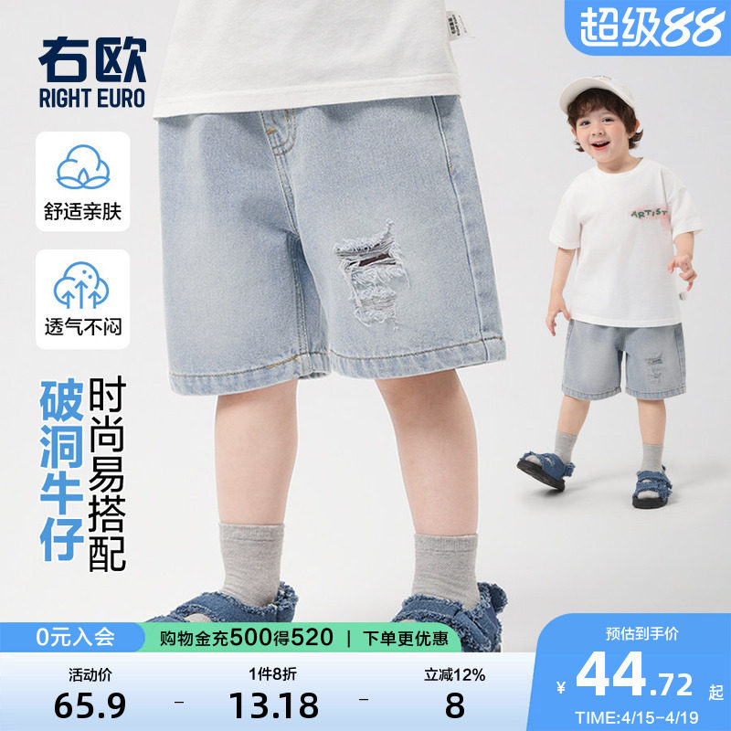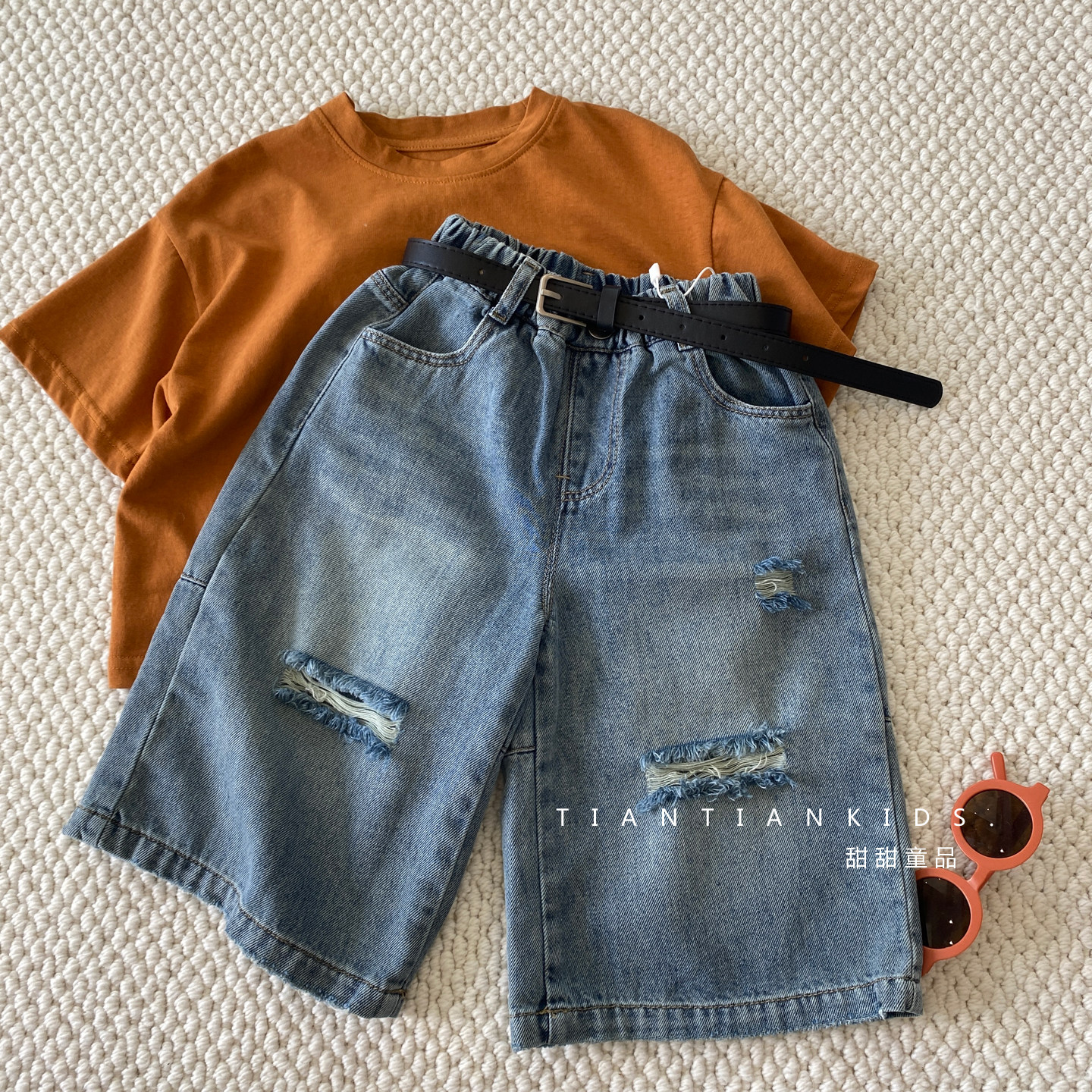 右欧男童牛仔中裤破洞女童五分裤子蓝色时髦夏季新款童装儿童短裤