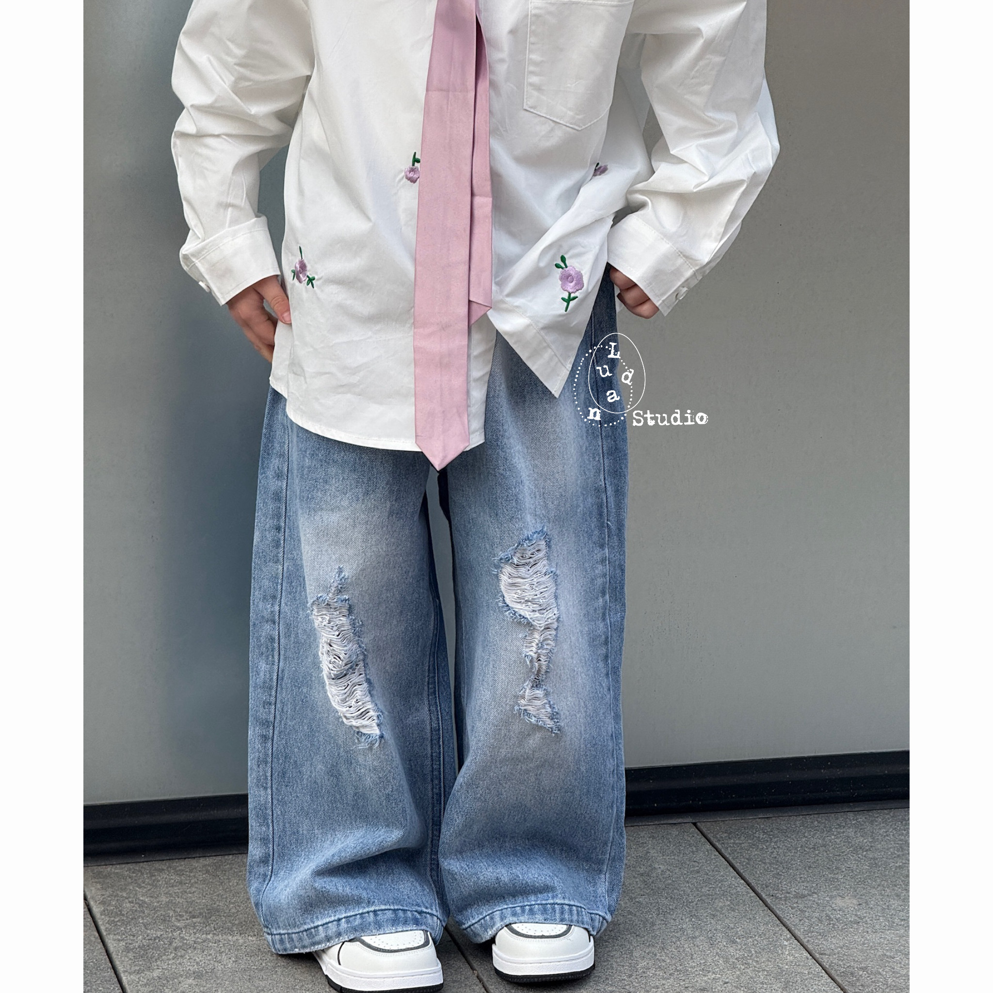 【春上新】卤蛋童装·随性破洞直筒轻薄宽松牛仔裤男女童25005