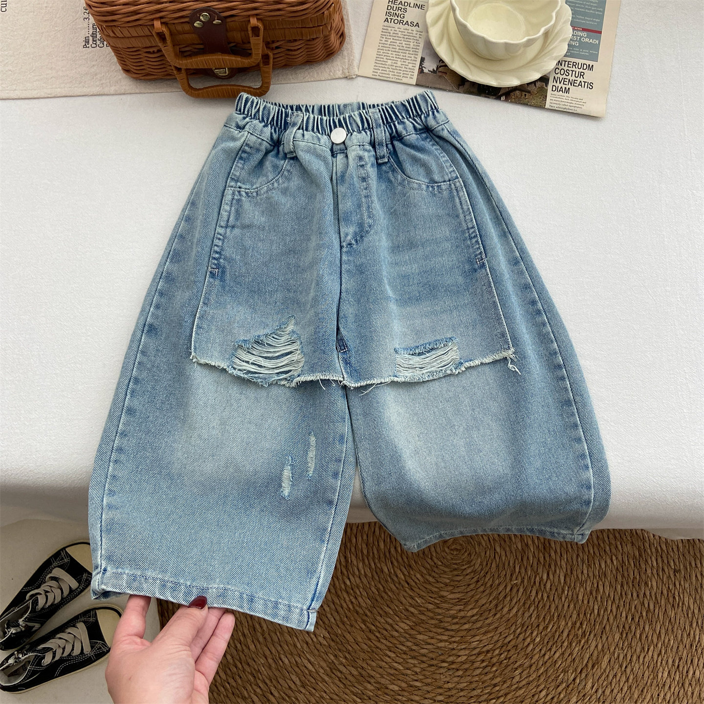小女森女童春夏破洞牛仔裤儿童时髦春秋裤子中大童休闲直筒阔腿裤