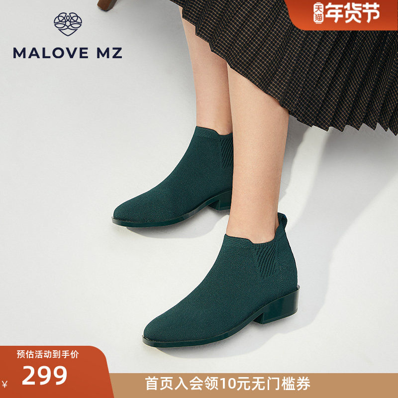 MALOVE MZ短靴女秋冬针织平底英伦方头切尔西靴瘦瘦靴烟筒时装靴